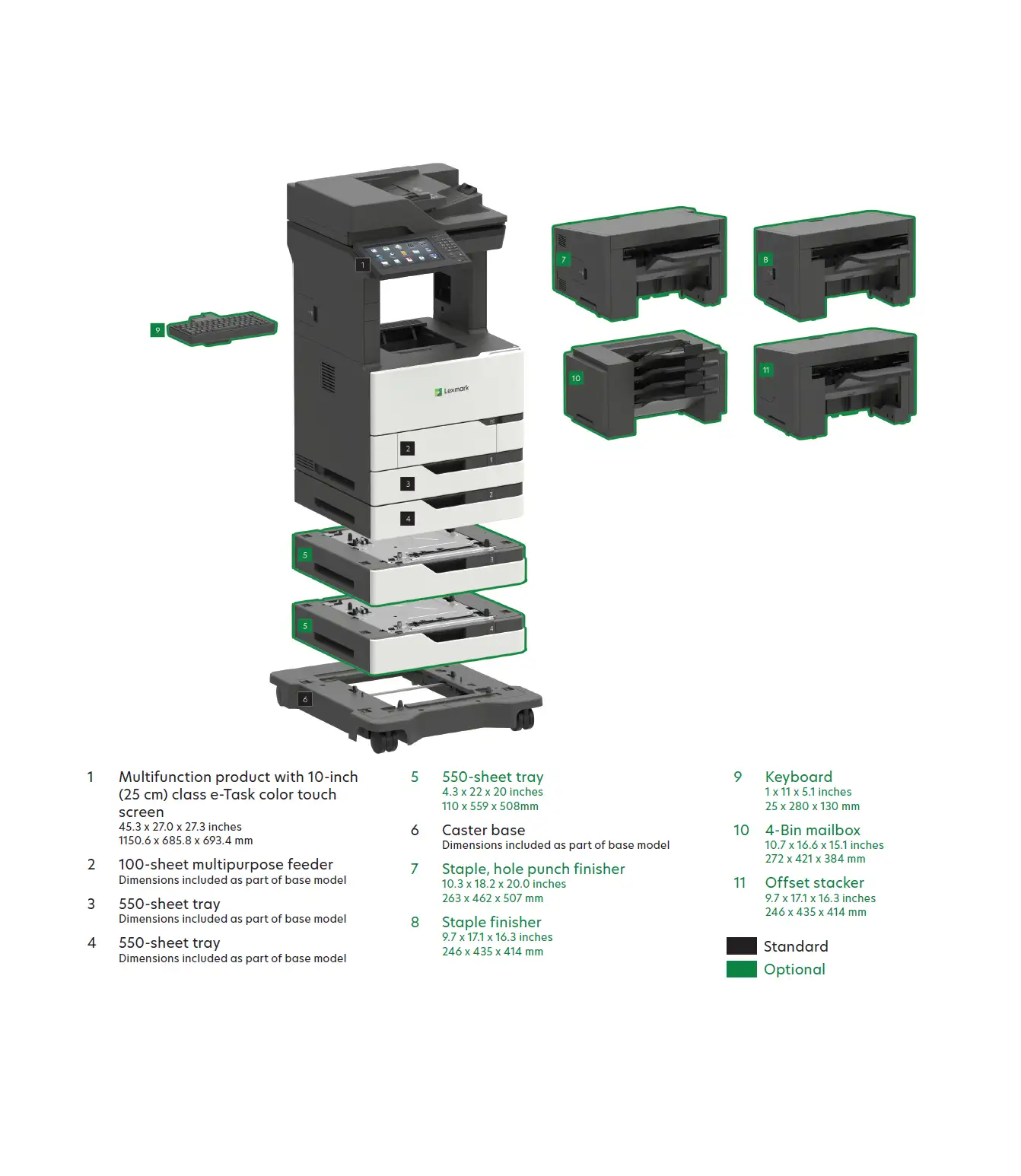 Navigate every function from an intuitive 10-inch color touchscreen with tablet-like responsiveness and customizable productivity apps. The MX826ade handles up to 1,200 sheets of standard paper input — expandable to 3,300 sheets — across a wide range of media types and sizes, with optional staple, hole punch, mailbox, and offset stacker finishing to give your documents a polished, professional finish right out of the machine. A standard hard disk with OCR and enhanced scanning capabilities means your team can digitize, route, and archive documents without ever leaving the device.